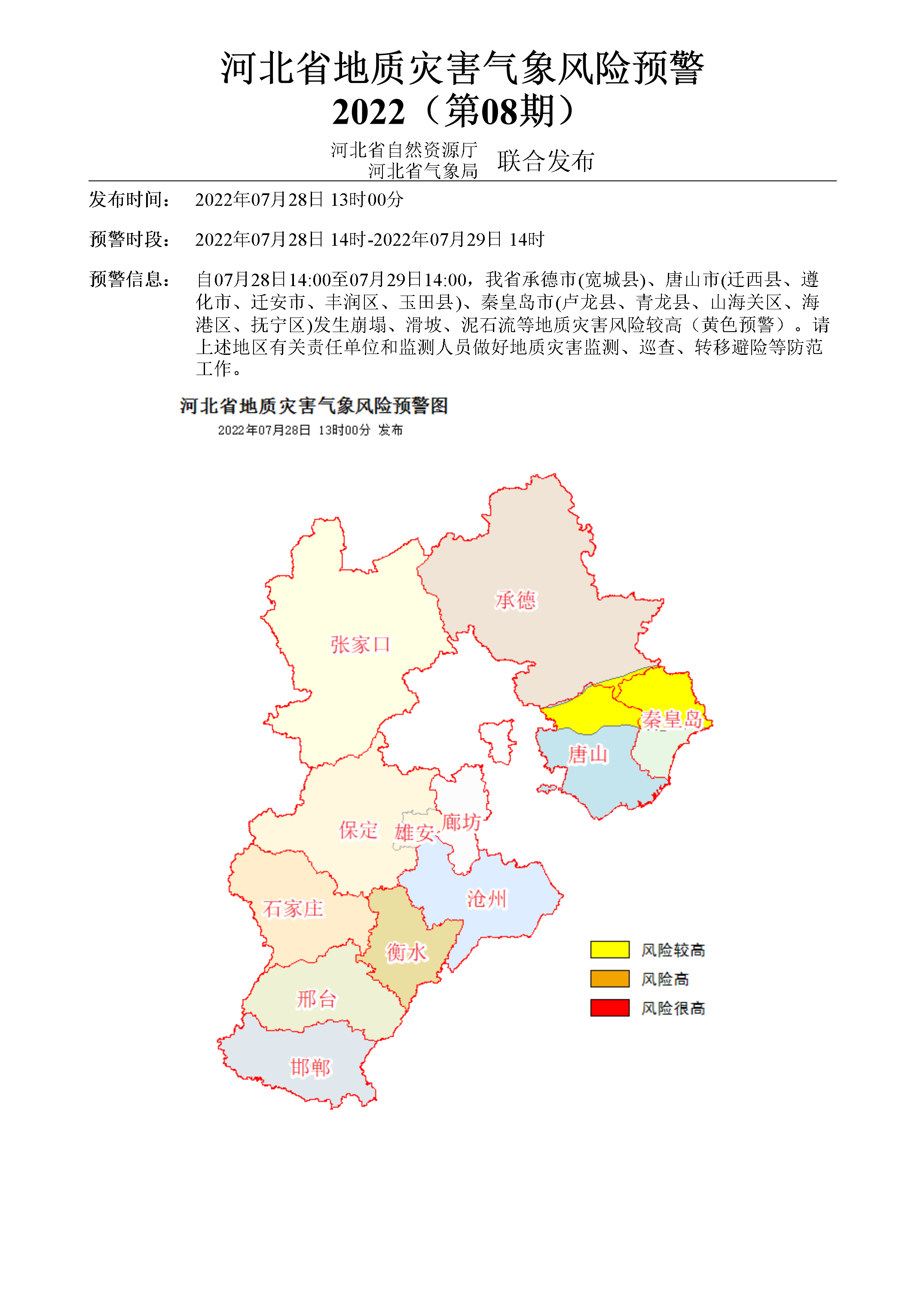 預警時段(2022年07月28日 14時00分 至 2022年07月29日 14時00分)自07月28日14:00至07月29日14:00,我省承德市(寬城縣)、唐山市(遷西縣、遵化市、遷安市、豐潤區、玉田縣)、秦皇島市(盧龍縣、青龍縣、山海關區、海港區、撫甯區)發生崩塌、滑坡、泥石流等地質災害風險較高(黃色預警)。請上述地區有關責任單位和監測人員做好地質災害監測、巡查、轉移避險等防範工作。